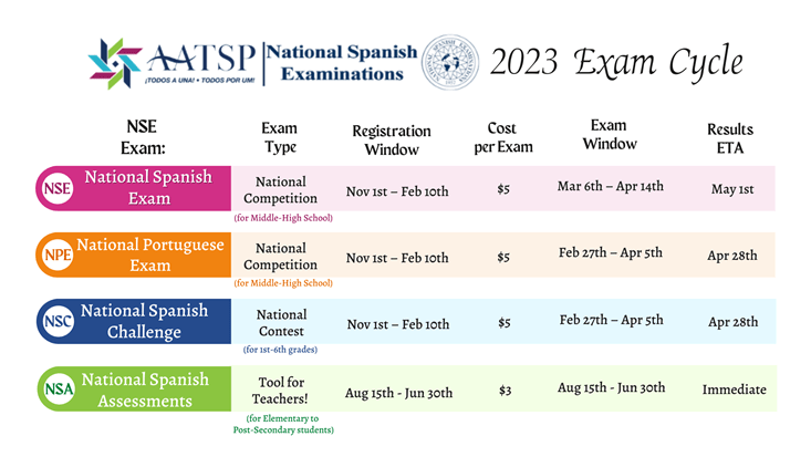 The National Spanish Exam (NSE) is an online, standardized assessment competition for Grades 6 -12, given voluntarily by about 4,000 middle and high school teachers throughout the United States, to measure the performance (interpretive communication) and achievement of students who are studying Spanish as a second language.